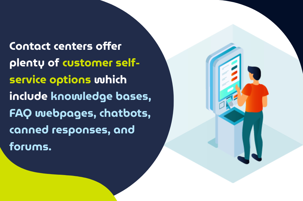 Call centers nowadays use IVR as a self-service tool for customers. However, IVR can also lengthen the support process because of its indirect approach which could annoy customers. Contact centers offer plenty of customer self-service options, which include knowledge bases, FAQ webpages, chatbots, canned responses, and forums.