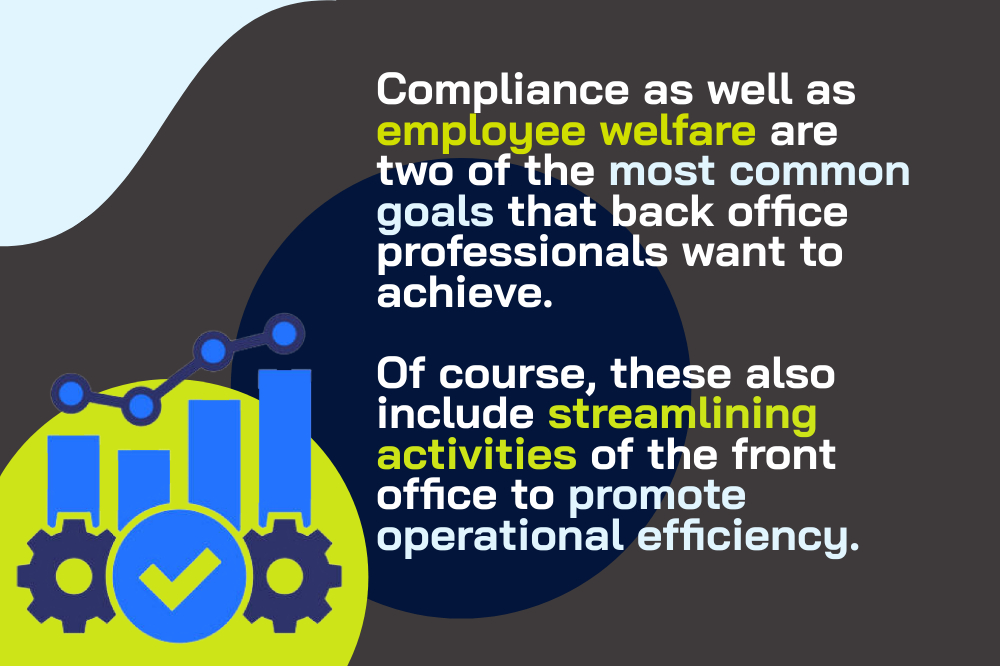 Image with text discussing goals for back office professionals, including compliance, employee welfare, and streamlining activities for operational efficiency in both front office and back office settings, alongside graphics.