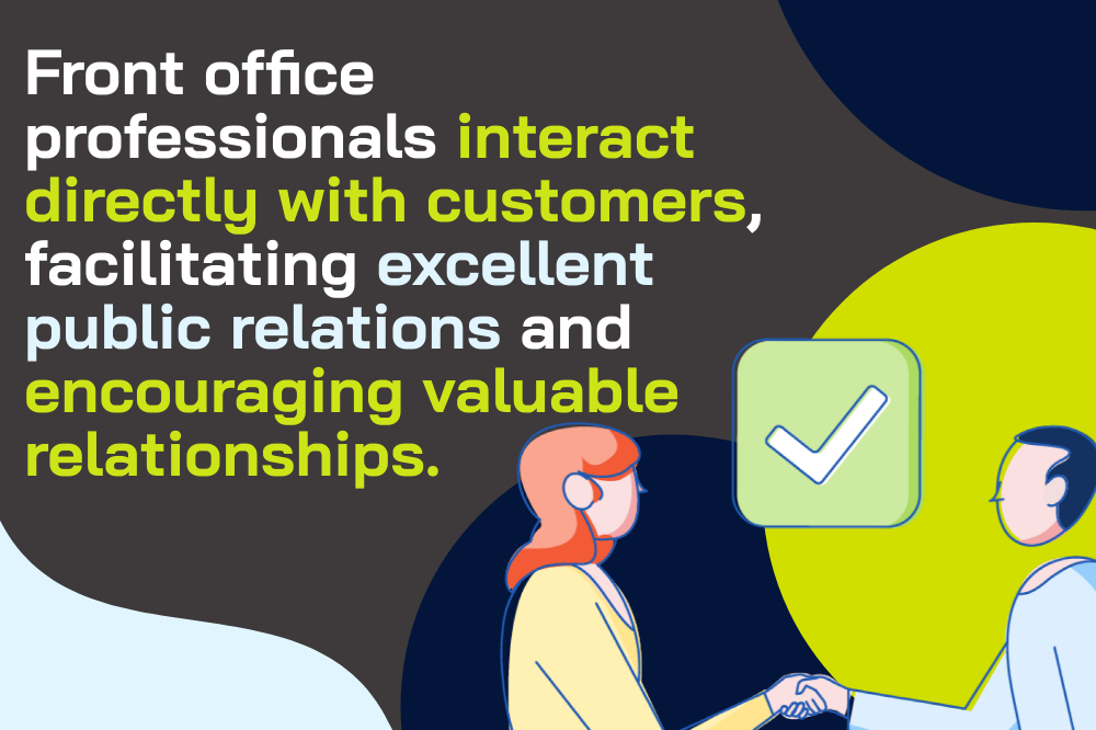 Illustration of two people shaking hands, highlighting front office vs back office roles in customer interaction and public relations. A green checkmark icon is present.